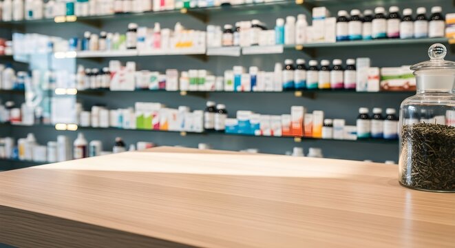 Pharmacist organizing medications in a modern pharmacy, creating a professional atmosphere. The shelves are stocked with pills, reflecting a commitment to health