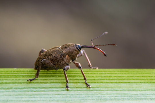 Close up of a Curculio glandium beetle on a grass blade and blurred background