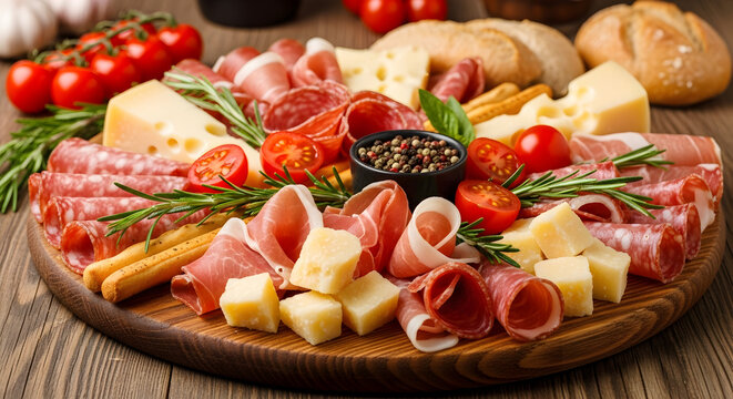 Gourmet meats and cheeses artfully arranged for culinary delight