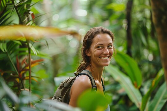 A woman with a bright grin, exploring a lush tropical jungle, her curiosity piqued by the vibrant flora and fauna that surround her, each step filled with wonder and excitement
