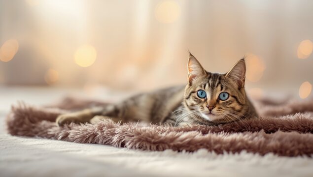 A curious tabby cat with striking blue eyes lounging on a cozy blanket, highlighting feline alertness and comfort