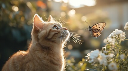 A Scottish Fold cat curiously observing a butterfly in a garden