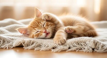 Adorable orange kitten sleeping peacefully on a cozy blanket indoors.