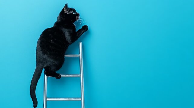 15.Side view of a black cat climbing halfway up a silver aluminum ladder, one paw reaching up, its tail curled for balance, set against a clean blue backdrop, emphasizing motion and curiosity.