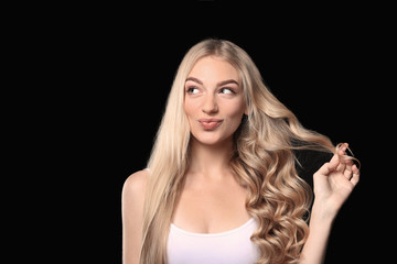 Beautiful young woman with straight and curled hair on dark background