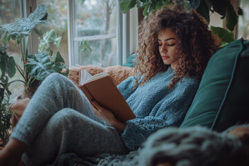 Woman curled up on a couch, engrossed in a book.