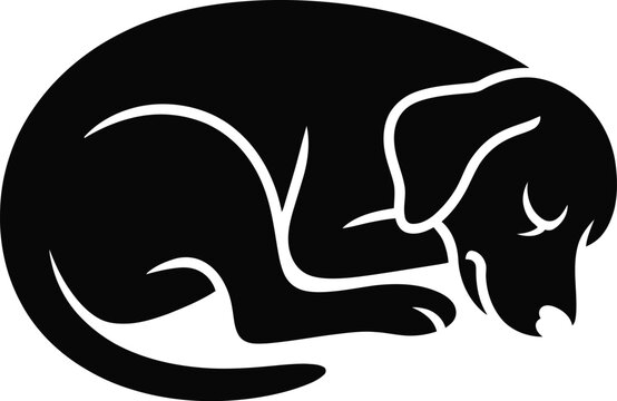 Cute furry sleeping dog curled up pose in silhouette vector pet art