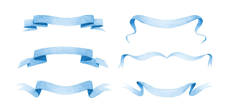 Set of six decorative blue ribbons in different shapes. Watercolor hand drawn illustration isolated on white background. Collection of banner elements. Celebration and graphic design concept for print