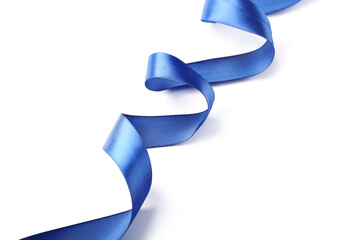 blue ribbon and bow, Curly blue gift ribbon on shiny background close-up.