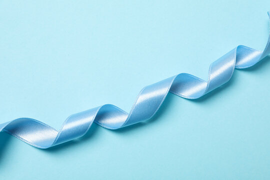 Blue ribbon on a blue pastel background. Top view, copy space.