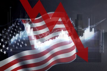 The American flag is reflected in the background of stock market charts and numbers, a double exposure photograph with high resolution Generative AI