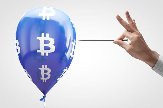 Concept: Depreciation of cryptocurrency.Crypto currency symbol on a blue balloon and needle in hand.