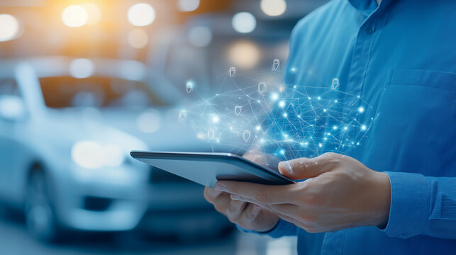 A digital representation of auto insurance coverage on a tablet, with a sleek car in the background.