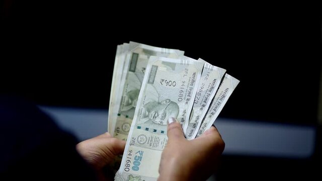 Close up of hand holding showing and flipping stack of 500 rupees Indian currency notes. Budget, savings, black money, profit, illegal income, wealth, success, corruption and bribery concept.