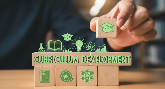 Curriculum development text on wooden blocks with education icons and a hand holding a graduation cap