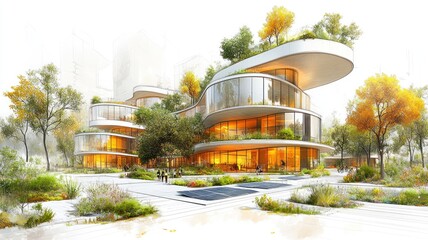 Modern architectural design featuring curved buildings and greenery.
