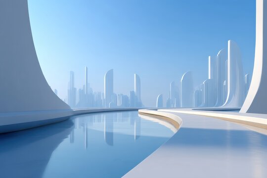 Hyperrealistic photo futuristic city skyline smooth curved buildings reflective water surface clean minimal blue tones futuristic vision, Selective Focus