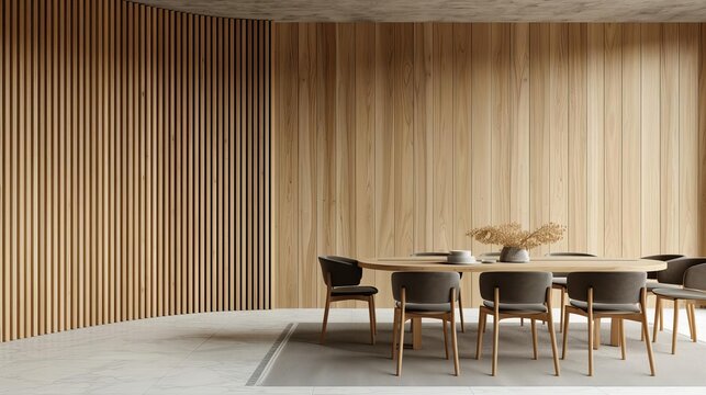 sleek minimalist dining room with curved wooden wall panels modern interior design showcasing simplicity and elegance 3d architectural illustration