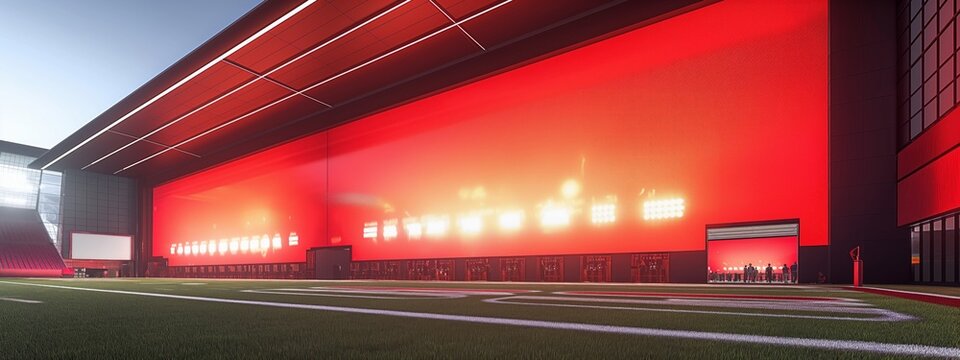 Mockup red curved LED display screen full stadium width, football stadium, branding, advertising