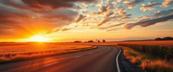 Empty asphalt road curves through sunlit golden cornfields at sunset, dramatic clouds overhead, sun, autumn