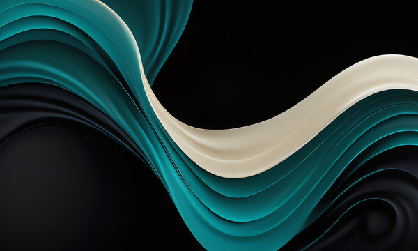 Abstract fluid wallpaper with smooth, undulating curves in shades of teal, black, and cream. Dynamic wavy patterns create a mesmerizing, contemporary design perfect for modern interiors.
