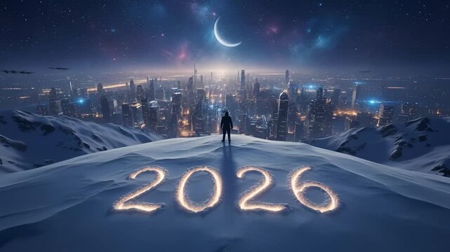 Standing on the cusp of 2026, gazing towards a bright future city under a celestial night sky, embodying hope, progress, and futuristic vision