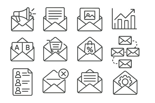 E-commerce Email Icons. Line style icons of e-commerce email marketing: email campaign icon, newsletter icon, product showcase