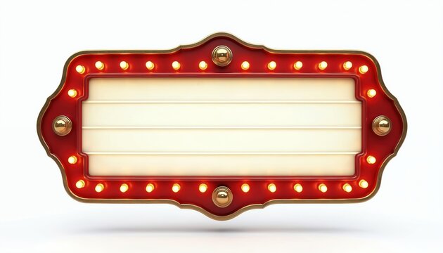 Retro cinema marquee sign with glowing bulbs, red and gold frame, and blank message space. Vintage style signboard suitable for theaters, casinos, or events. Offers custom text capability.