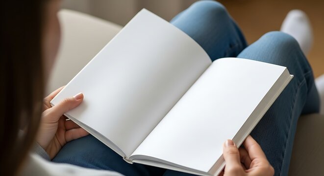 Person holding an open blank book with empty white pages, perfect for showcasing custom text, illustrations, or branding
