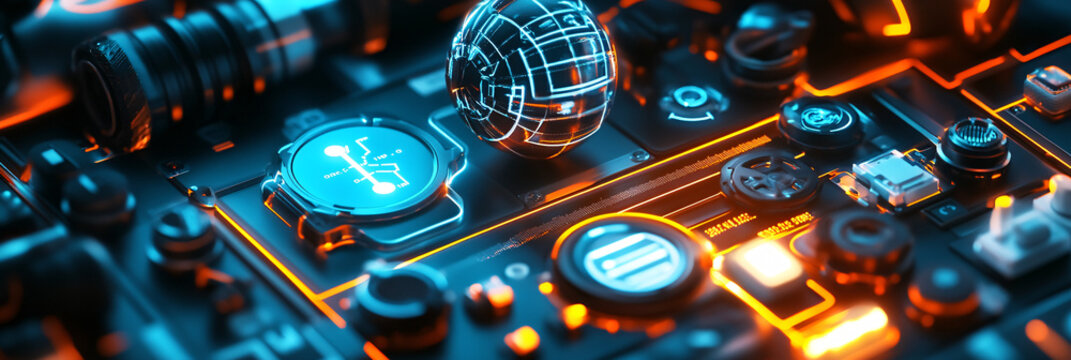 A glowing sports equipment maintenance icon linked to usage data, representing online platforms for gear care and optimization.