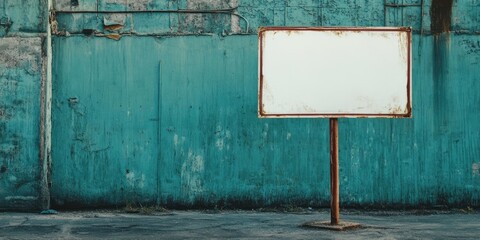 Rusty blank sign on metal pole stands against a weathered teal wall with peeling paint and concrete surface, ideal for custom advertising messages