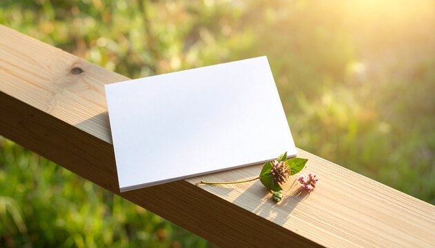 Blank white paper card mockup on a rustic wooden railing, illuminated by warm morning sunlight in a natural outdoor setting, perfect for custom messages or elegant design presentations