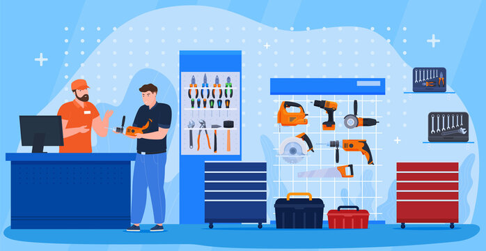 Male customer buying perforator at tool shop consulting with seller cashier counter vector