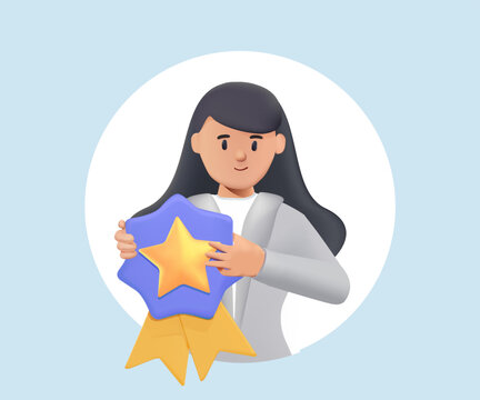 Winner trophy award. First place. Gold star award. 3D character, Employee of the Month vector illustration. Elegant businesswoman vector holding award. Congratulation for the best worker 3D render