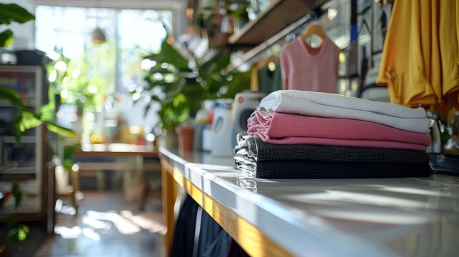 Professional laundry counter with neatly folded clothes,  high quality lens, bright and welcoming atmosphere, service reliability