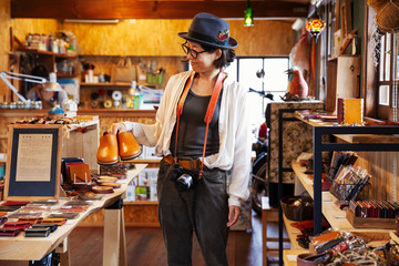 Japanese woman wearing hat and glasses browsing merchandise in a leather shop.