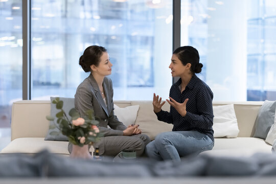 Multiethnic businesswomen, Caucasian and Indian female workmates sit on cozy sofa in modern office lobby lead informal conversation during break at workspace. Communication at workplace, discussion
