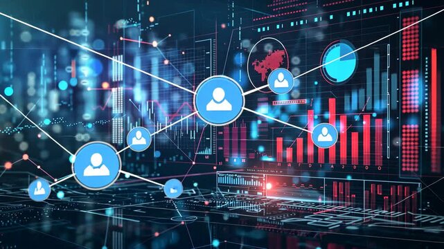 A network of people is shown on a screen, connected by lines and data points