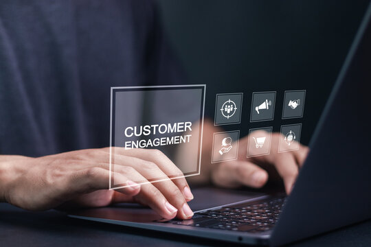 Customer engagement concept. Target customer, buyer persona and customer behavior. Person using laptop with customer engagement icon on virtual screen.