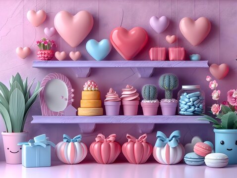 Floating Heart Icons on Pastel-Colored Ecommerce Wishlist Scene for Online Shopping and Customer Favorites