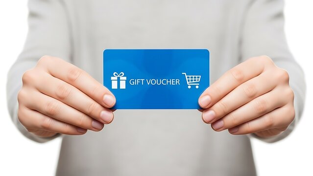 Two hands are in the act of exchanging a gift card while shopping in a busy retail environment