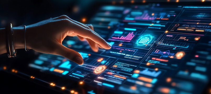 Businessman touch automated data management system to create reports with KPIs and indicators connected to the database. Data analysis with intelligent AI robot technology in business analysis.