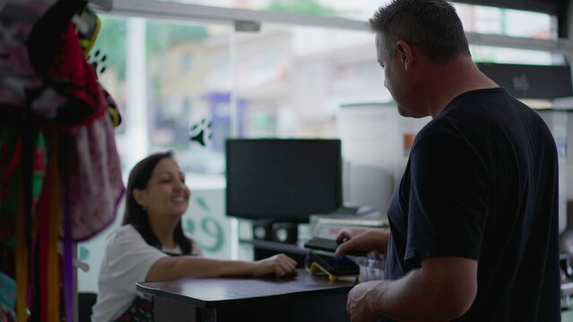 A customer service AI robot assisting a man in a modern store, demonstrating the use of robotics in enhancing customer experiences and providing digital assistance