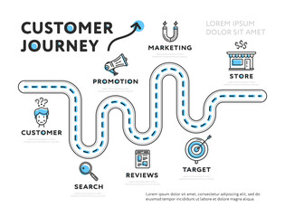 Customer journey marketing map. Advertising and purchases strategy and infographics with online search to promote marketing sales and vector user service
