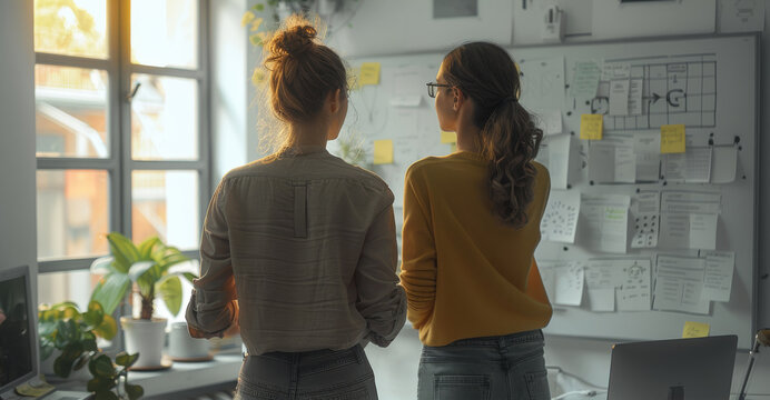 Two employees discussing their customer journey map on a whiteboard in a friendly and bright office. Generative AI.