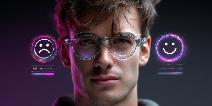An AI powered facial emotion recognition system analyzing customer feedback in a retail store, providing real-time sentiment analysis, glowing sentiment interface