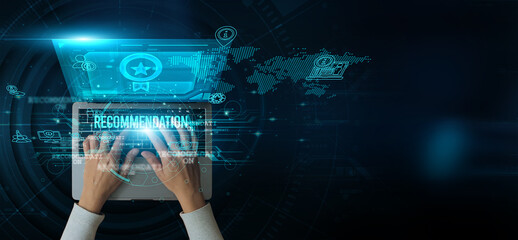 Man using a laptop with the recommendation on the keyboard, analyzing customer behavior, product trends, sales performance feedback data, purchase history, marketing strategy, and competitor analysis.