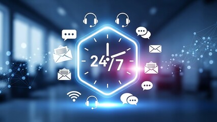 Professional Offering 24/7 Customer Service Support with AI Chatbot and Communication Icons on Virtual Holographic Interface
