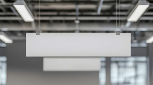 A banner mockup elegantly hangs from the ceiling in a bright indoor venue with soft shadows