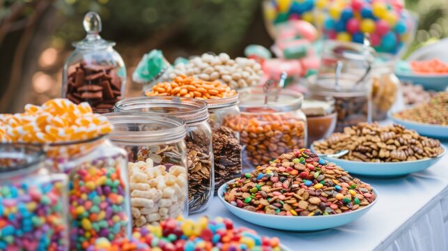 A birthday party with a DIY trail mix bar for guests to mix their own snacks.